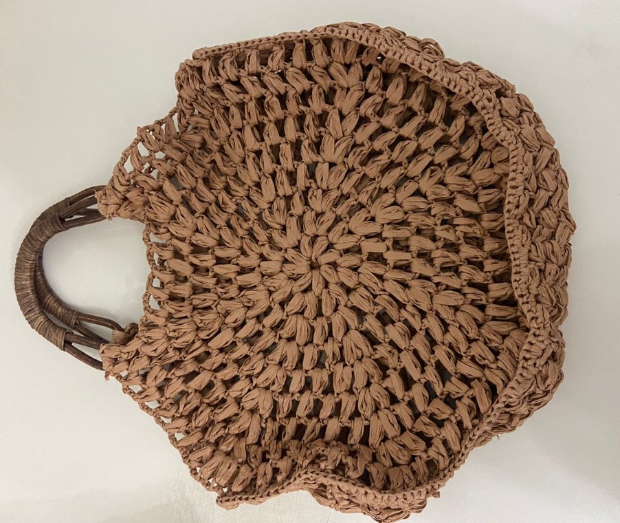 Koyu kahverengi, örgü dokulu kadın çantasıdır. Bohem tarzda, desen içermeyen ve günlük kullanıma uygundur.
