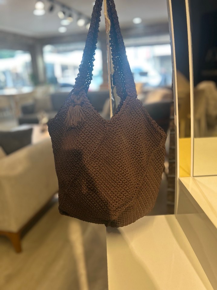 Koyu kahverengi, örgü dokulu, bohem tarzda kadın çanta. Günlük kullanıma uygun, yumuşak dokulu ve desensiz bir modeldir. el örgüsü