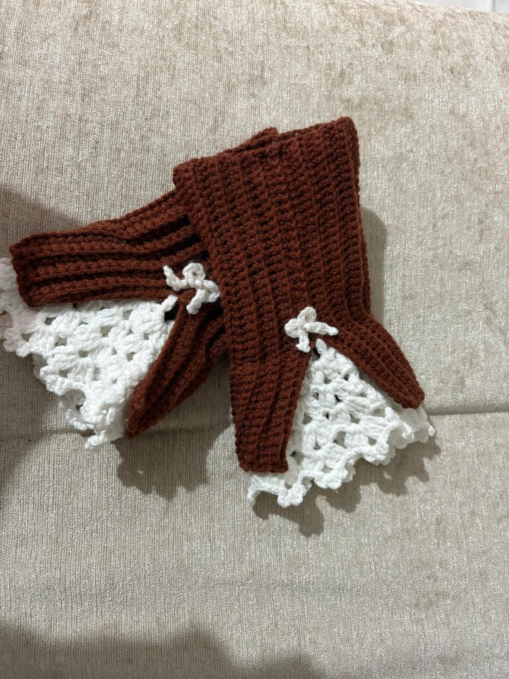 Kahverengi örgü kadın eldivenler, beyaz dantel detaylarla bohem ve rahat bir görünüm sunar.