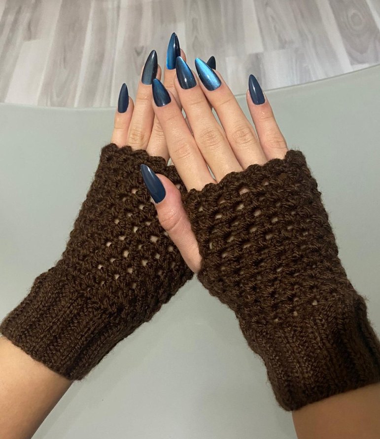 Kahverengi örgü, bohem tarzda, açık örgü desenli ve rahat kesimli kadın eldiveni. Retro ve hippie görünüme uygun.