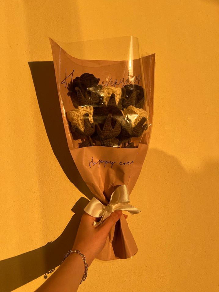 Koyu kahverengi örgü çiçeklerden oluşan, açık kahverengi kağıda sarılı ve saten kurdele ile bağlanmış el yapımı buket.