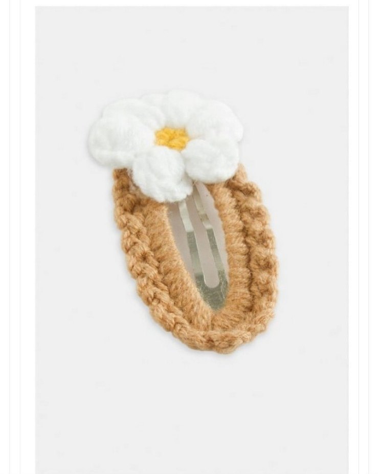 kahverengi örgü çocuk tokası, beyaz çiçek desenli yummuşak ve bohem tarzda tasarlanmıştır.