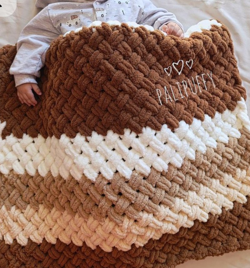 Işık kahverengi örgü çocuk battaniyesi, işlemeli desenli, sıcak ve yumuşak dokulu.