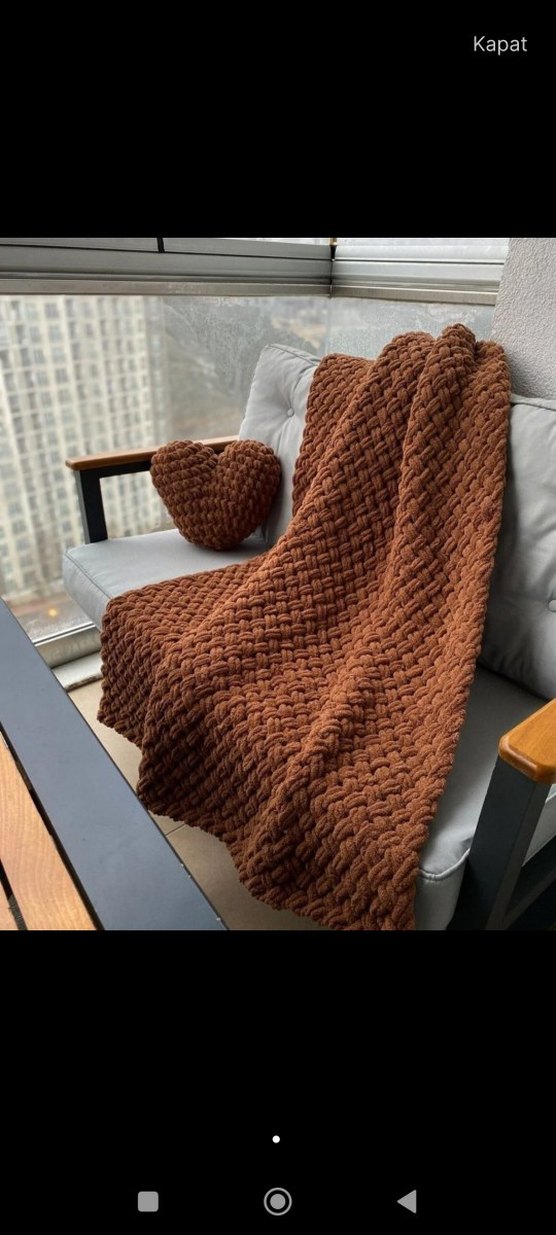 Koyu kahverengi örgüden yapılmış, desensiz ve yumuşak dokulu battaniye Rahat anlar için uygundur.