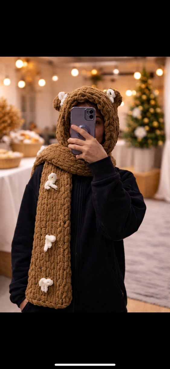 Kahverengi örgü çocuk bere ve atkı seti, bere üzerinde sevimli kulak detayları ve atkıda dekoratif süslemeler içerir. Rahat ve şık bir sokak stili parçası.