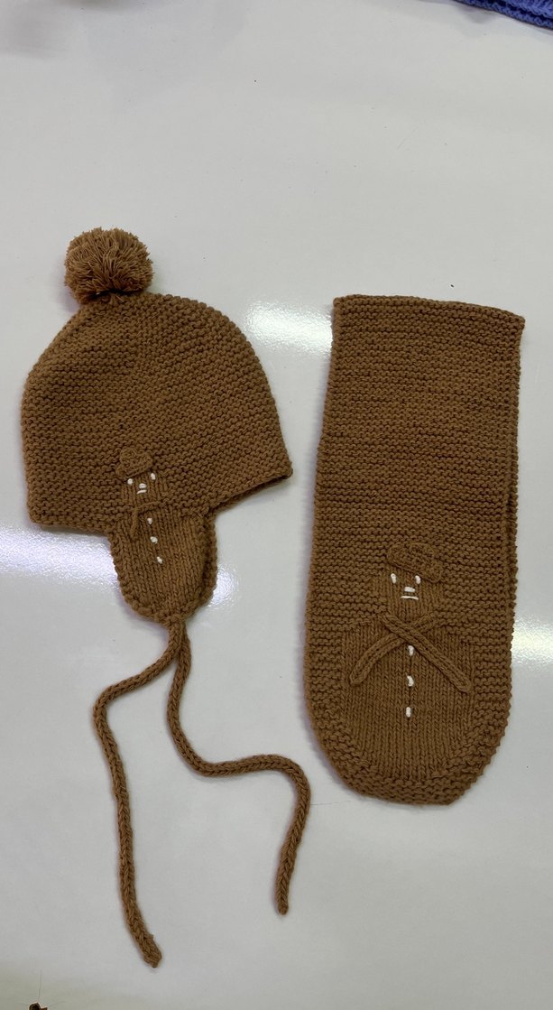 Kahverengi örgü çocuk bere, kulaklıklı ve ponponlu, işlemeli detaylı atkı ile birlikte set halinde sunulur.