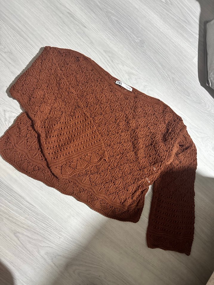 Geniş kesim, kahverengi örgü kadın kazak, uzun kollu ve bollaşan kol modeli . Kısa boyu ve bohem tarzıyla günlük kullanıma uygun, çok az kullanıldı herhangi bir problemi yoktur