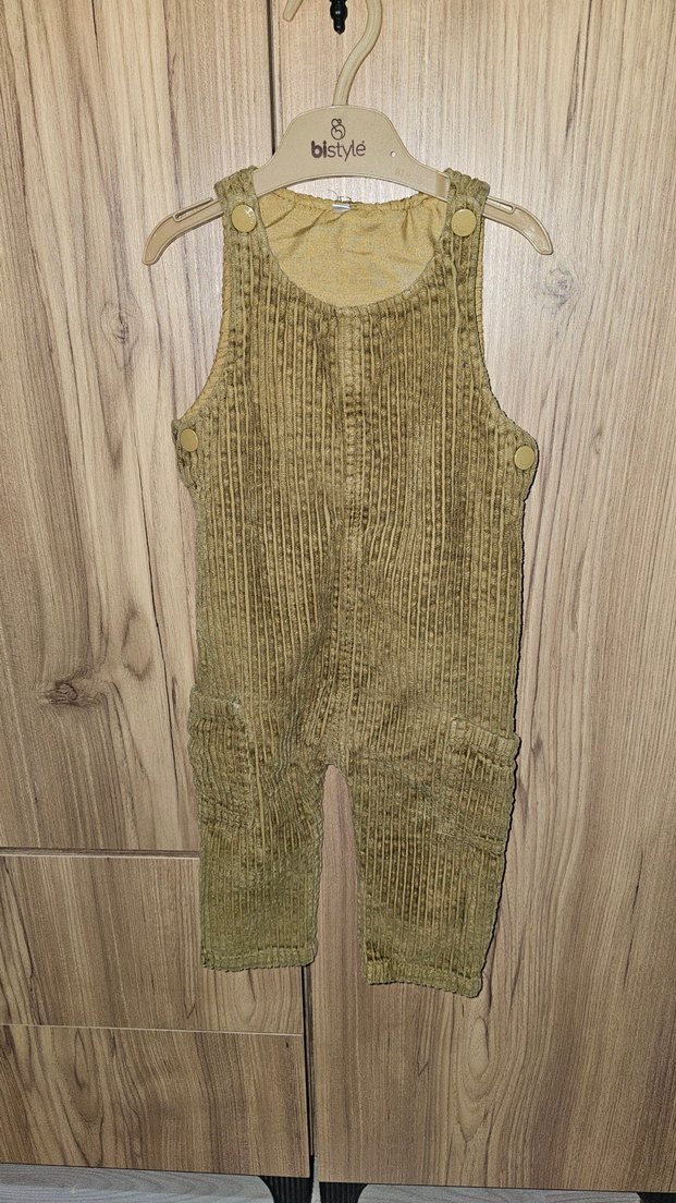 Kahverengi örgü erkek çocuk salopet, bol kesim ve kolsuz. Bohem tarzda, düzensiz desensiz ve düğmeli askılıdır. Yumuşak, kabartmalı dokusu vardır.