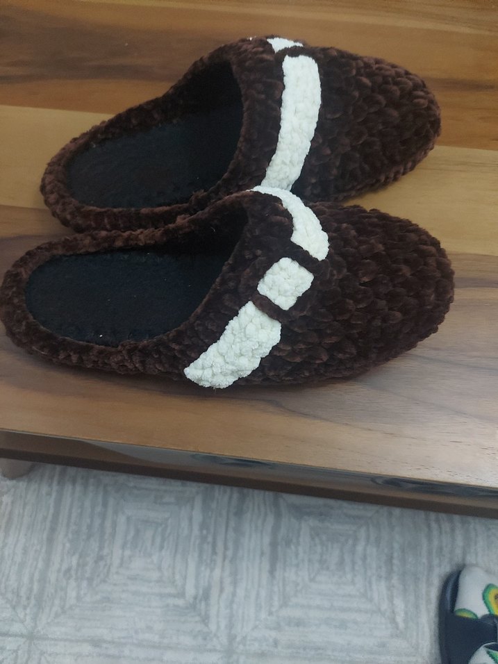Koyu kahverengi örgü kumaştan yapılmış, beyaz tokalı kayışlı ve kama topuklu erkek terlikleri. Günlük kullanım için uygundur.