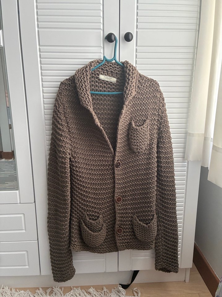 Kahverengi örgü hırka , yakalı, uzun kollu ve bol kesimdir. Üç ön cepli, midi boyda ve günlük kullanıma uygun rahat bir normcore tarz sunar.