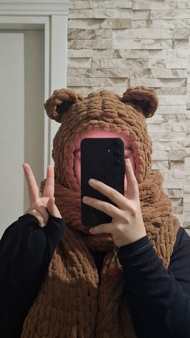 Koyu kahverengi örgü atkı ve kapüşon seti, sevimli ayı kulakları ve rahat dokusuyla bohem ve retro sokak stilini yansıtıyor.