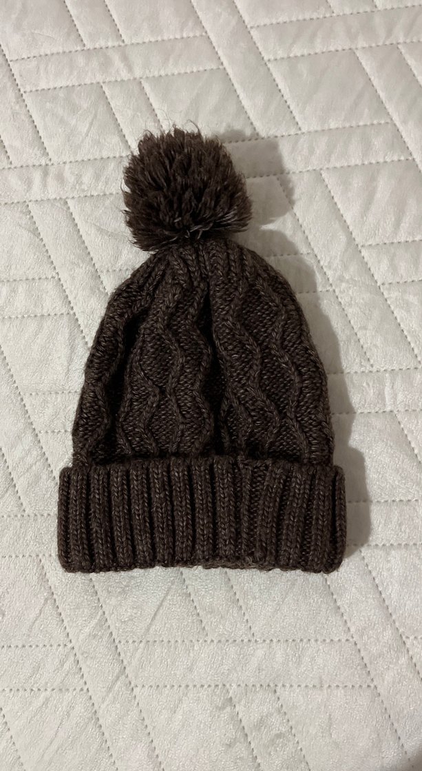 Kahverengi örgü kadın bere, yumuşak dokusu ve üstündeki ponponuyla sıcak tutar.