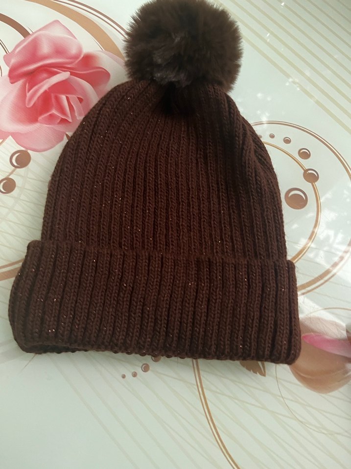 Yumuşak örgü kumaştan, üzerinde ponpon bulunan koyu kahverengi kadın bere, rahat sokak stili için uygundur.