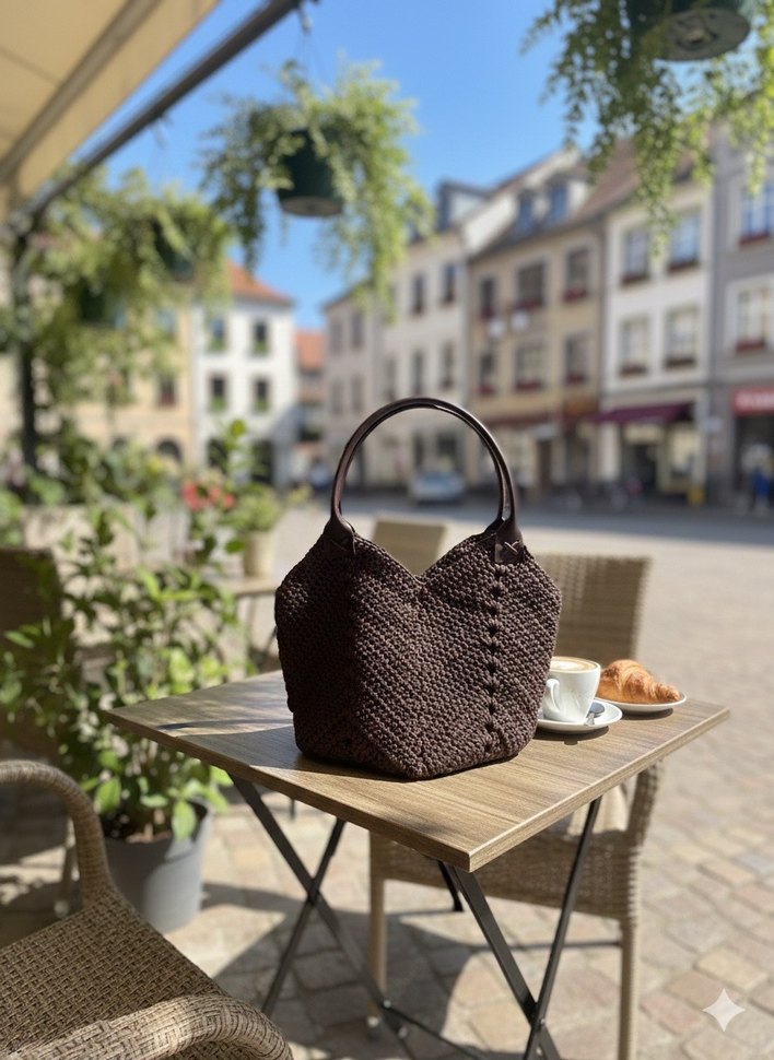 Koyu kahverengi örgü dokusuyla kadın çanta, bohem tarzda, trend ve avangart görünüme uygun. Rahat örgü kumaşı günlük kullanıma uygun.