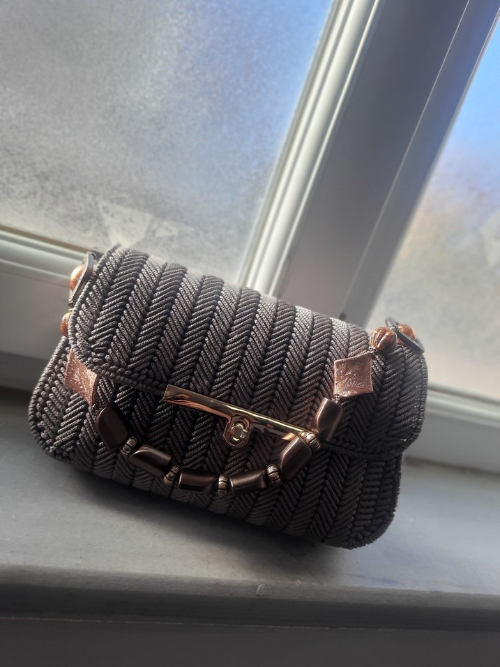 Kahverengi örgü kumaştan yapılmış, tokalı kapamalı ve yılan derisi desenli kadın çantası. Günlük kullanıma uygun bohem ve klasik tarzı bir arada sunar.