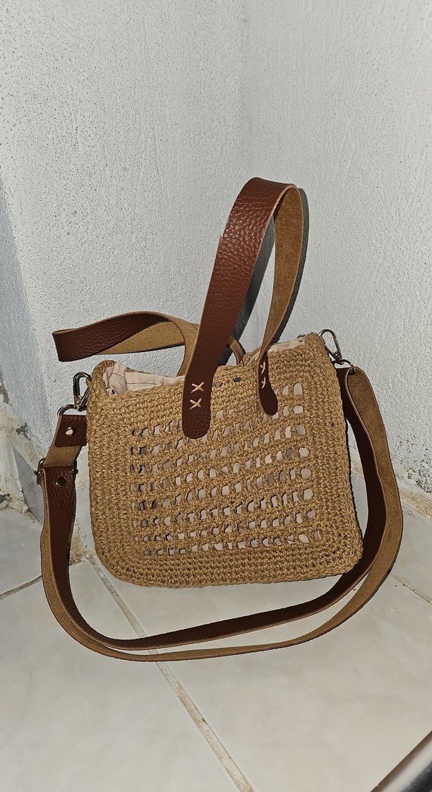 Kahverengi örgü kumaştan, kemerli ve ayarlanabilir askılı, bohem ve minimalist tarzları birleştiren kadın çantası. kendi el emeğimle yaptım.
