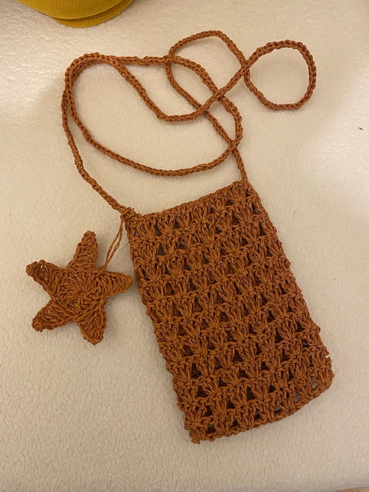 Kahverengi örgü kadın çapraz çanta, nakışlı desene ve yıldız şeklinde süslemeye sahiptir, rahat bohem tarz için uygun.
