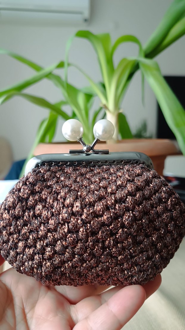 Kahverengi örgü dokusuyla, inci detaylı vintage kapanışı olan bohem tarzda günlük kullanıma uygun kadın cüzdanı.