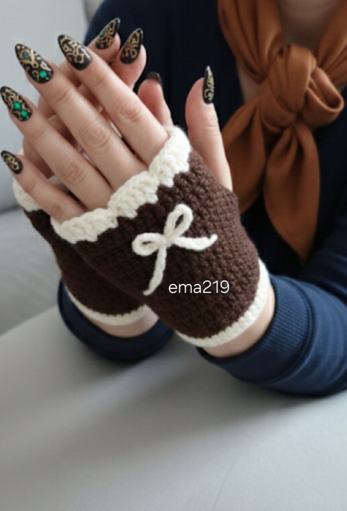 GÖRSEL BANA AİTTİR ✔️ İLAN AÇIYORUM Bohem tarzda, kahverengi örgü kadın eldivenleri, beyaz fiyonk detayları ve rahat dokusuyla parmakları açık bırakır. Kahverengi örgü kadın eldivenler, bilekte beyaz fiyonk detayıyla rahat ve sıcak bir dokunuş sunar.