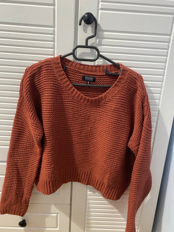 Kahverengi örgü kazak, yuvarlak yaka ve uzun kolludur. Rahat kesimi ve sokak tarzıyla günlük kullanıma uygundur.
