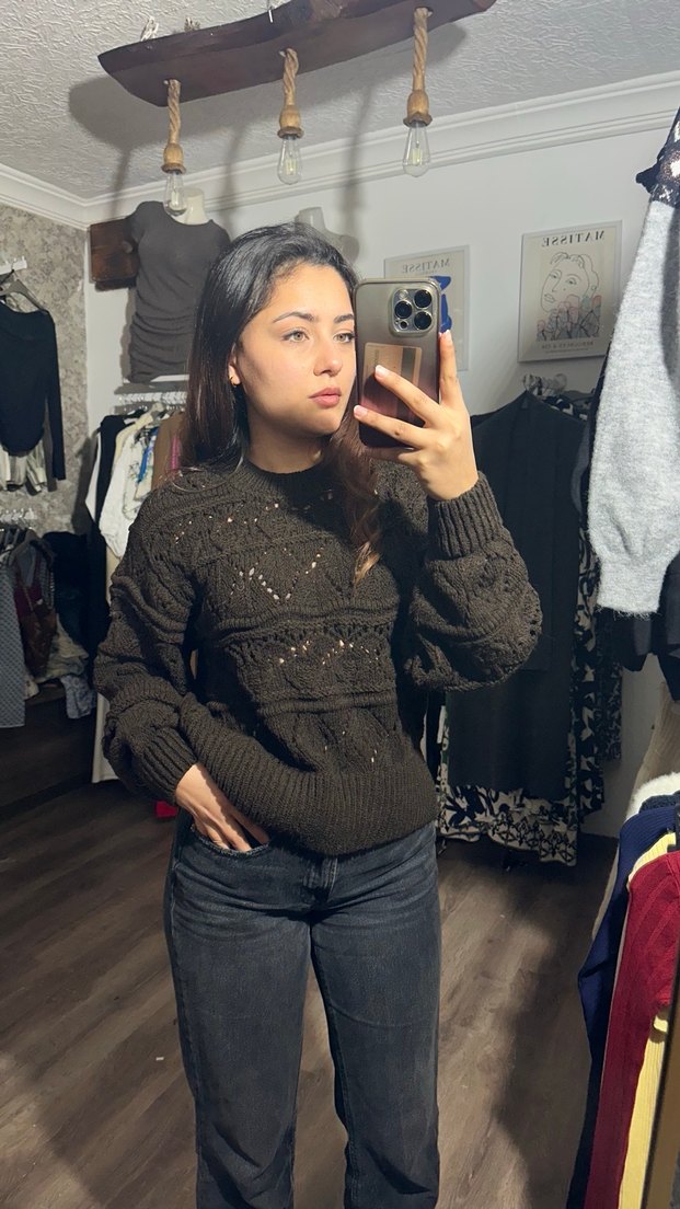 Bu kahverengi örgü kadın kazak, uzun kollu ve bisiklet yaka detayına sahiptir. Rahat ve desen içermeyen tasarımı günlük kullanıma uygundur.