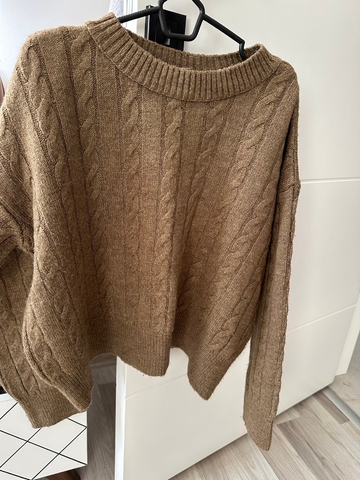 Kahverengi örgü kazak, yuvarlak yaka ve uzun kollu, bol kesimiyle günlük rahat ve sıcak bir görünüm sunar.