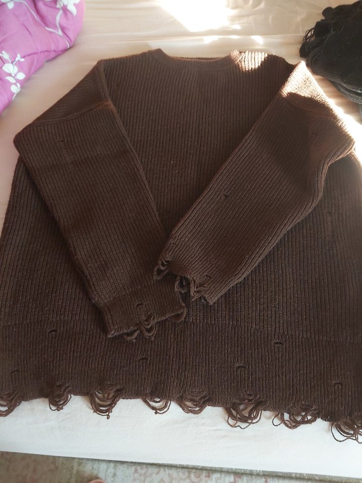 Kahverengi, örgü kumaştan, yuvarlak yakalı ve uzun kollu, bol kesim bir kazak. Koyu renkte, desensiz ve yıpranmış etek ucu detaylı, gotik tarzda.