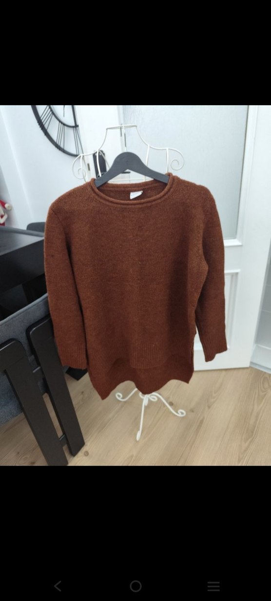 Kahverengi örgü kazak, yuvarlak yaka ve uzun kolludur. Rahat, midi boyu ve salaş kesimiyle günlük kullanıma uygundur.