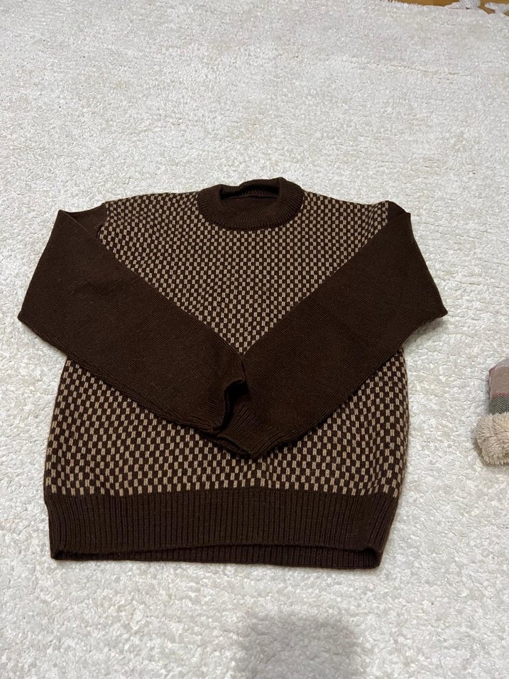 Kahverengi örgü kadın kazağı, yuvarlak yaka ve uzun kolludur. Rahat, bol kesim ve normal boyda, sade ve konforlu bir tarza sahiptir.