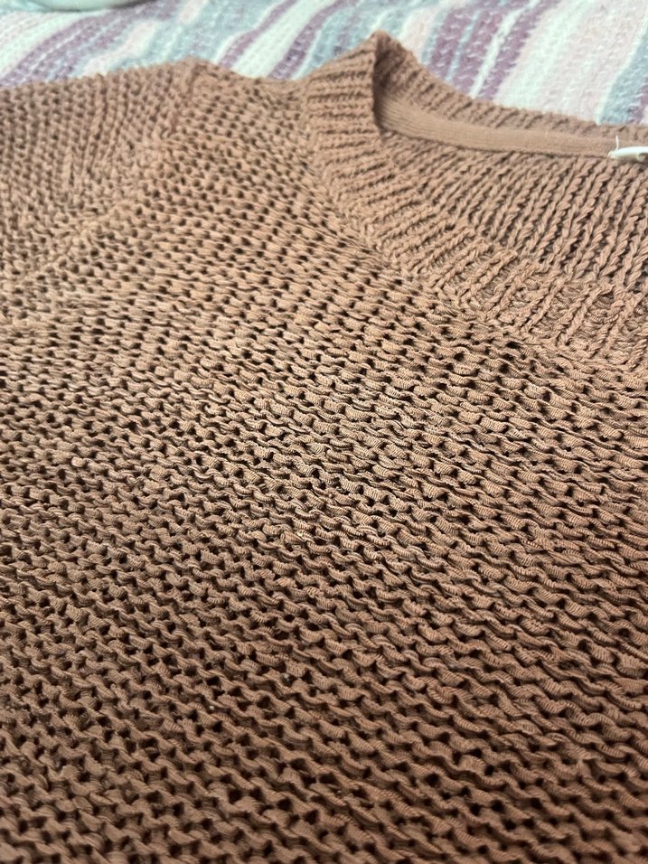 Kahverengi örgü kumaştan, yuvarlak yakalı ve uzun kollu, bol kesim bohem tarzda kadın kazak. Parlak dokusu ile rahat ve günlük kullanım için uygundur. Gömlek üstüne çok şık duruyor