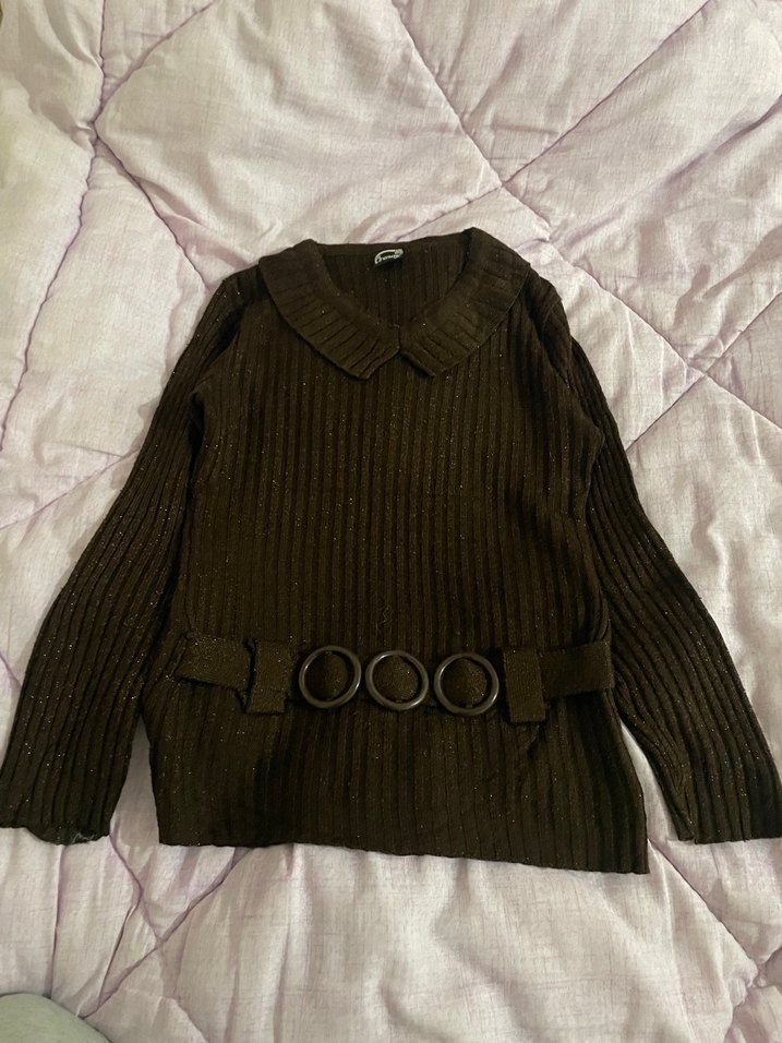 Uzun kollu, yakalı ve örgü kumaştan yapılmış kahverengi kadın kazak. Kemer detayı ve sıkı kesimiyle gündelik kullanıma uygun rahat ve şık bir parça.
