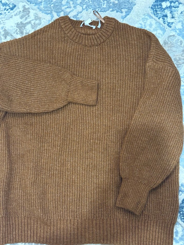 Bu koyu kahverengi örgü kazak, yuvarlak yaka ve uzun kollu, bol kesimiyle rahat ve sıcak bir stil sunar. Sade, desen içermeyen tasarımı günlük kullanıma uygundur.