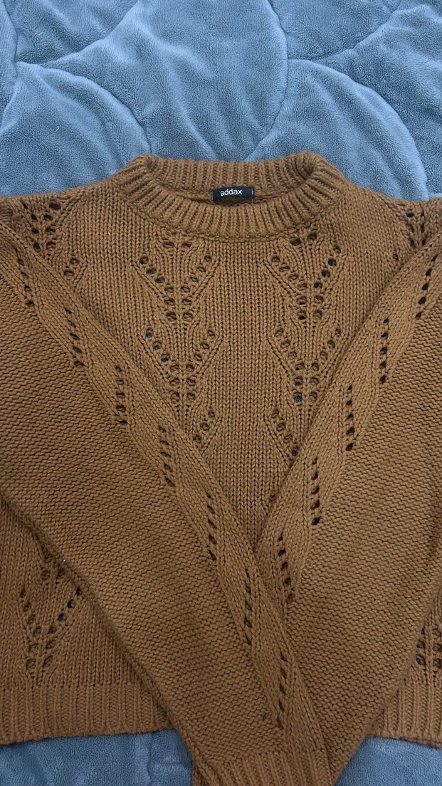 Kahverengi, standart beden ve ajurlu bir kazaktır. Rahat kesimi ve yumuşak dokusu günlük kullanıma uygundur. Normal boyda ve sade desenlidir. Yalnızca bir iki defa giydim.