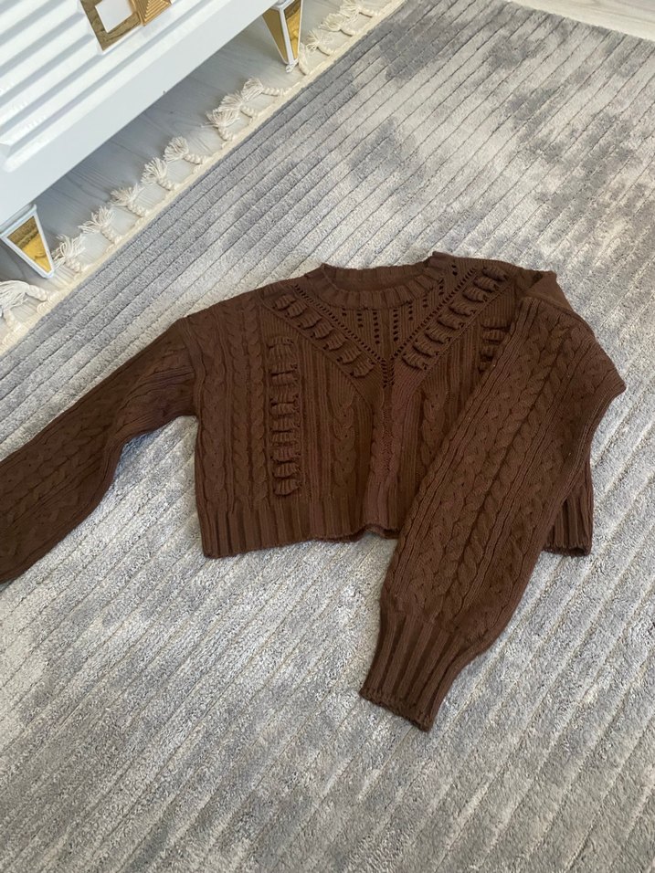 Kahverengi örgü kadın kazak, uzun kollu ve yuvarlak yakalıdır. Rahat kesimi ve normal uzunluğuyla günlük kullanıma uygundur. Kot üzerine çok hoş duruyor bedenini hatırlamıyorum yeni ama 1.2 defa giyildi kusuru yırtığı yok M beden L beden olabilir hafif bol bir yapısı var