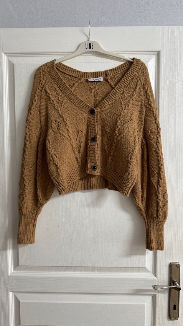 Kahverengi örgü kısa hırka, V yaka ve uzun kollu, bol kesimli tasarımıyla günlük şıklık için ideal. Bohem tarzıyla rahat ve sıcak bir görünüm sunar.