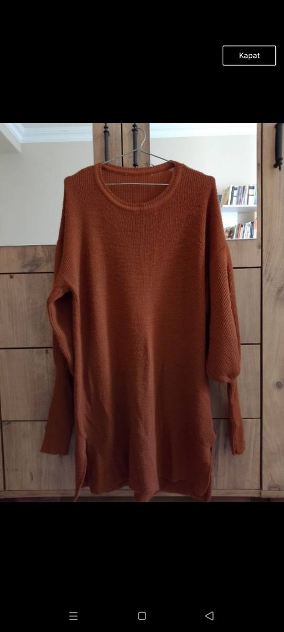 Kahverengi, örgü, yuvarlak yakalı ve uzun kollu, bol kesim midi kadın kazak. Yumuşak örgü kumaştan, günlük rahatlık için uygundur.