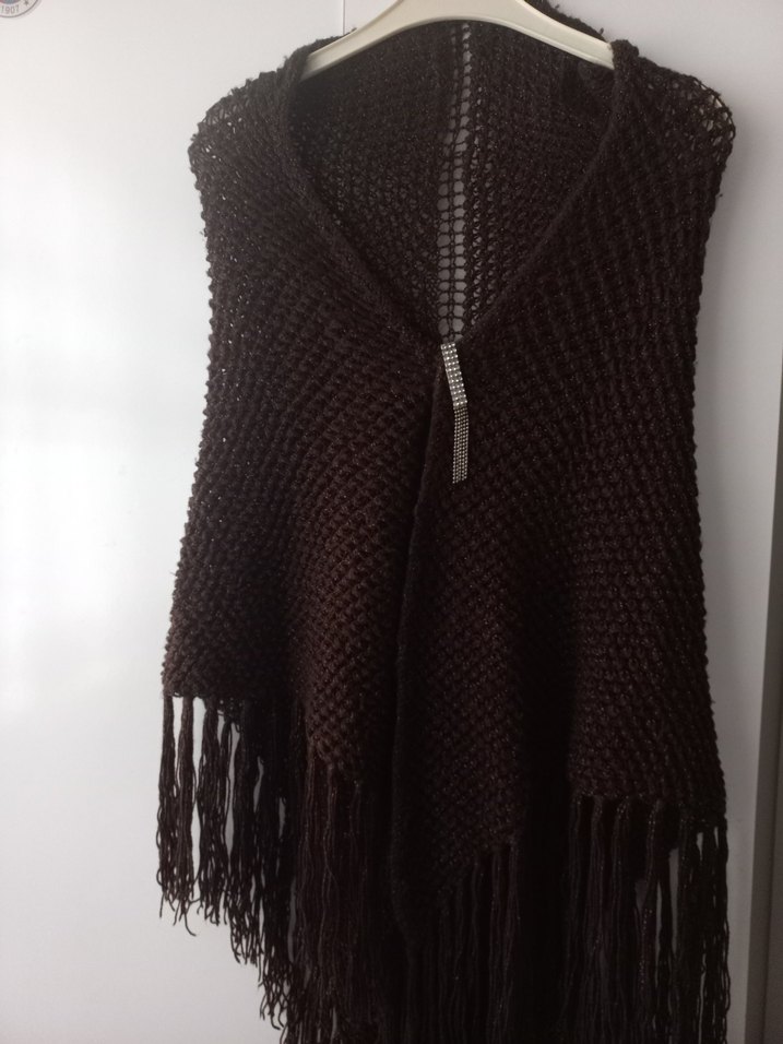 Kahverengi örgü kadın panço, püsküllü kenarları ve dekoratif tokası ile bohem tarzı sunar. Yumuşak ve sıcak dokusuyla katmanlama için uygundur.