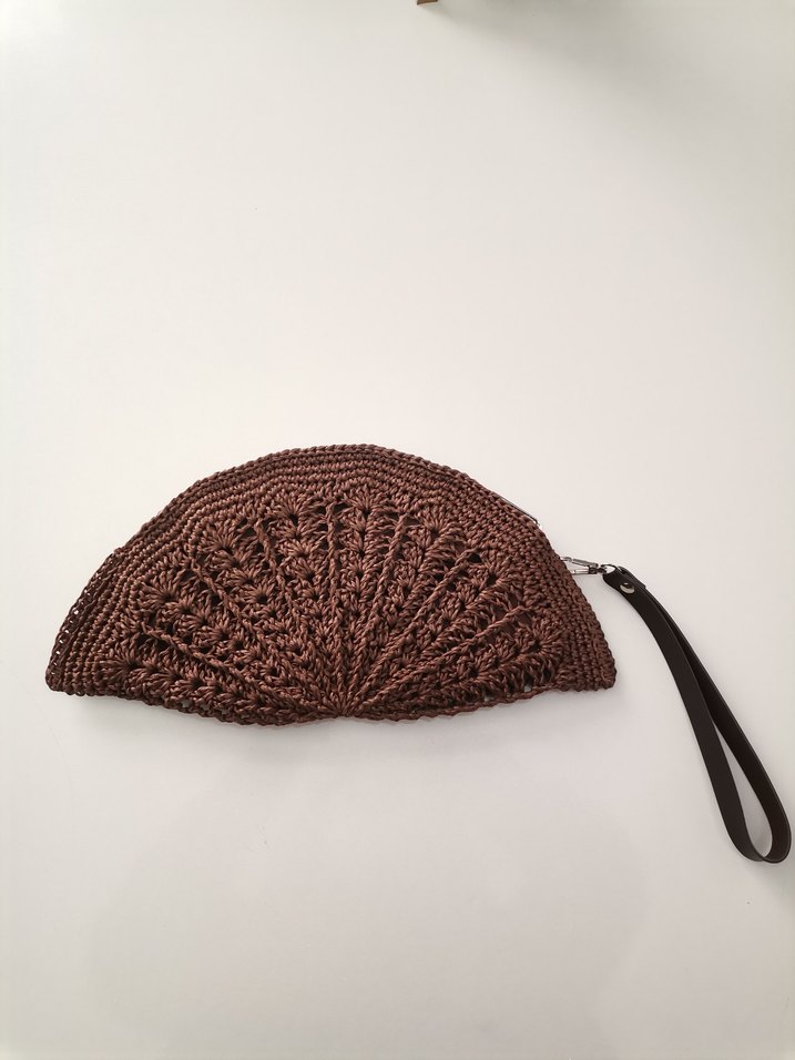 Kahverengi örgü yarım daire şekilli portföy çanta, bilek askılı ve minimalist bohem tarzda. Günlük kullanıma uygun. İstenilen renk ve adette hazırlanır