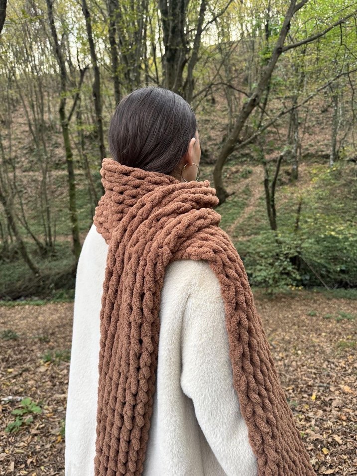Kahverengi, kalın örgü kadın şal, sıcak tutan ve bohem tarzı tamamlayan rahat bir tasarıma sahiptir.