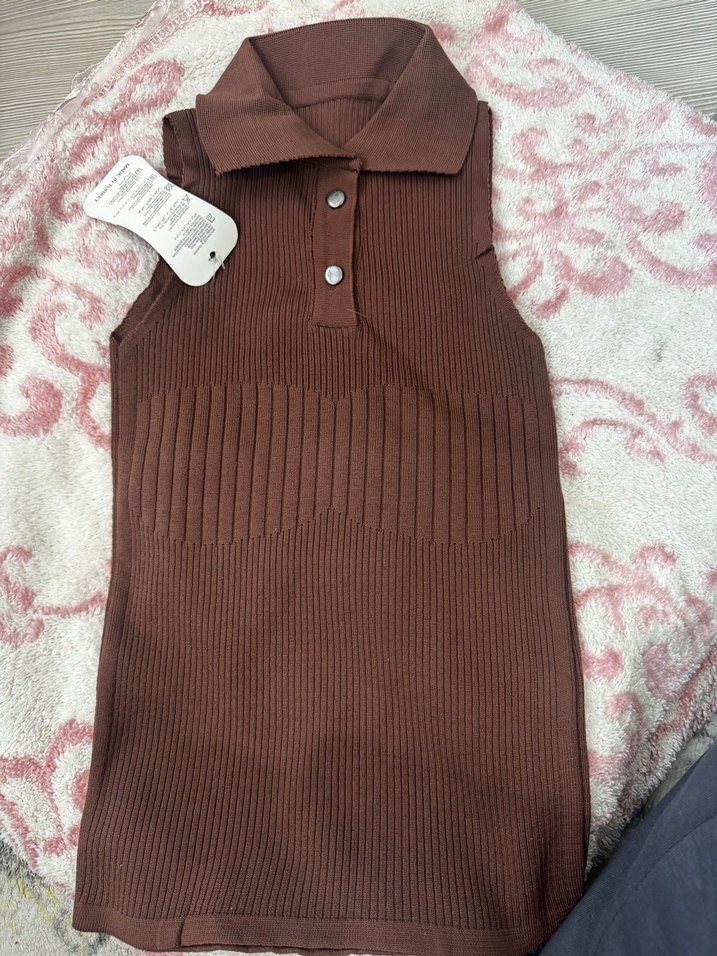 Kahverengi, örgü dokulu, yakalı ve kolsuz kadın süveter. Vücuda oturan kesimi ve midi boyuyla rahat sokak stiline uygun.