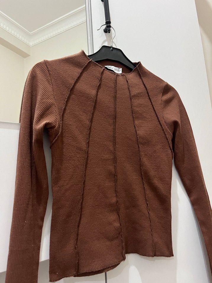 Kahverengi, uzun kollu, bisiklet yaka ve örgü dokulu triko. Keten kumaştan, günlük kullanıma uygun minimalist ve çağdaş tasarım. Kalıbı dar S-M uyumlu olur