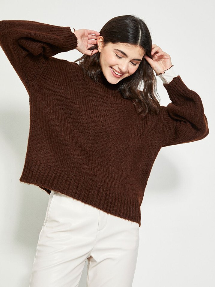 Koyu kahverengi, yün örgü, yuvarlak yakalı ve uzun kollu bu kazak, rahat ve bol kesimdir, günlük kullanıma uygundur.