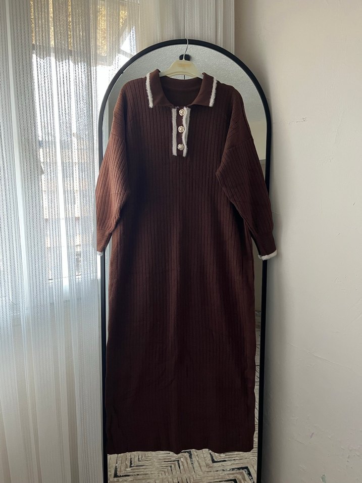 Kahverengi uzun örgü elbise, yakalı ve uzun kollu, bol kesimdir. 1 kere giyildi kışlıkdır.