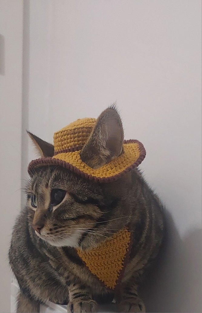 Kahverengi Örgü Kedi Şapkası ve Bandana