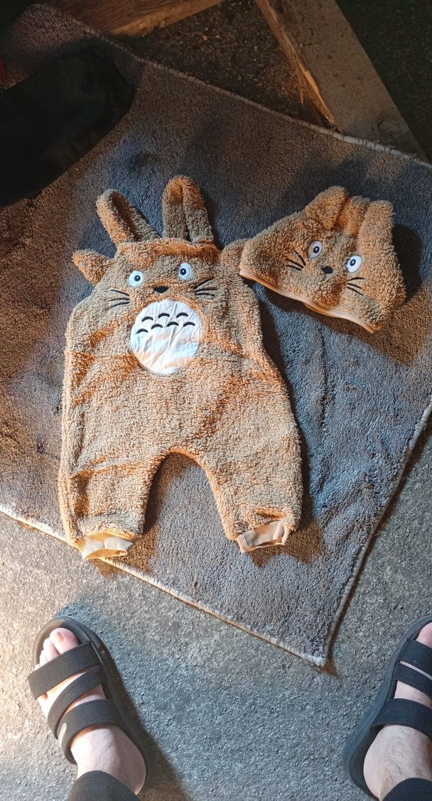 Yumuşak ve rahat örgü kumaştan yapılmış, sevimli hayvan yüzü desenli kahverengi kedi tulumu ve şapka seti.