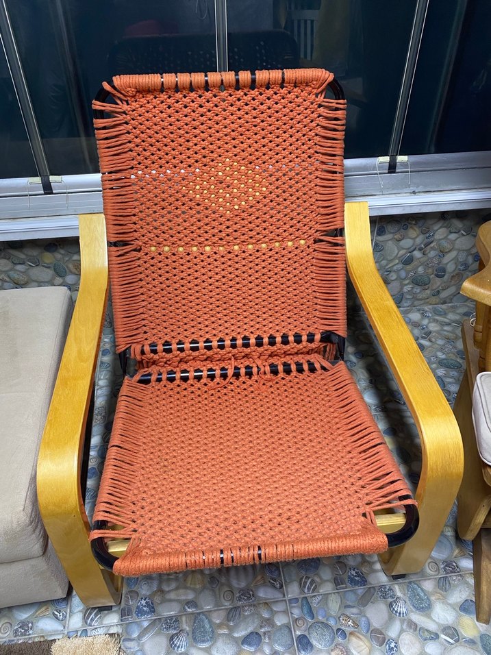 Bu sandalye, tırıncu örgü kumaş oturma ve sırt kısmı ile açık renk ahşap kolluklara sahiptir. Dayanıklı ve rahat tasarımlıdır.