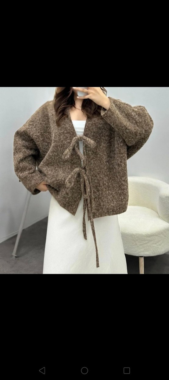 Kahverengi örgü midi uzunluğunda, bol kesim, uzun kollu ve yuvarlak yakalı rahat hırka. Günlük kullanıma uygun sade ve konforlu tasarım.