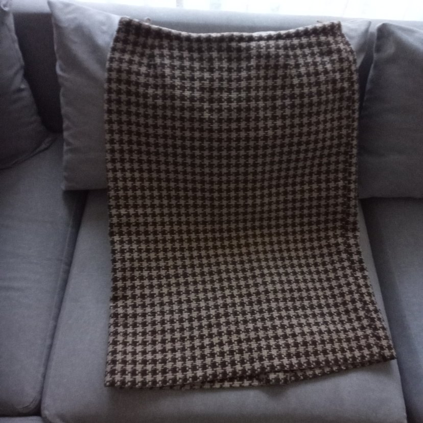 Ofis kullanımı için uygun, kahverengi örgü midi etek. Normal boyda, rahat kesim ve geleneksel tarzda, koyu renkte bir parça.