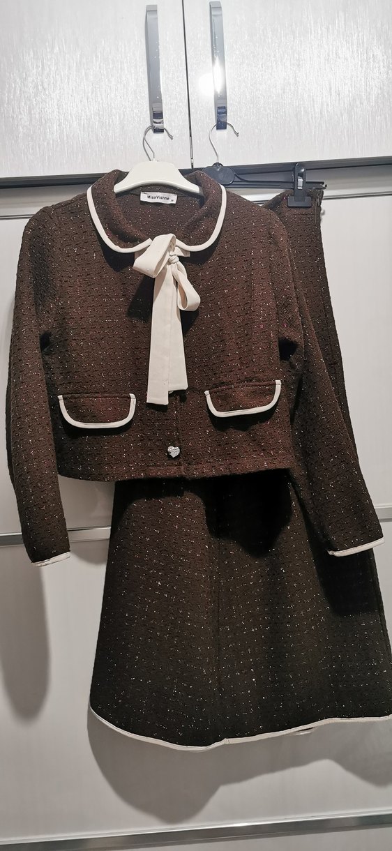 Kahverengi örgü kadın tüvit takımı, mini boy ve yakasında kurdele detayı ile dikkat çekiyor. Uzun kollu, regular fit ve beyaz şerit detaylı, ofis için modern klasik tarzda bir parça.