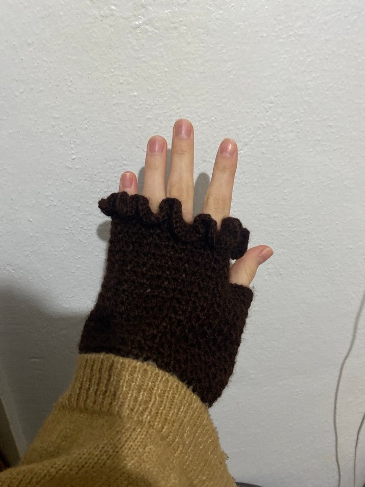 Koyu kahverengi örgü, parmakları açık gotik eldiven. Rahat örgü dokusu ve avangart stil ile trend belirleyiciler için uygun.
